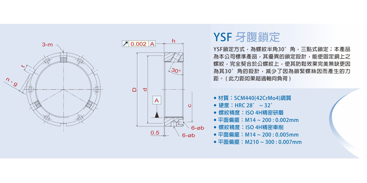 Đai ốc hướng xuyên tâm YSF, góc ren 30°, 3 điểm khóa; dòng này được coi là sản phẩm tiêu chuẩn của công ty, với thiết kế khóa ưu việt, có thể khớp giữa các ren đồng cố định với phần ren cái và ngăn chặn bất kỳ sự nới lỏng nào. Đặc biệt với thiết kế ren 30º cũng giảm được mô-men xoắn trên sản phẩm này.